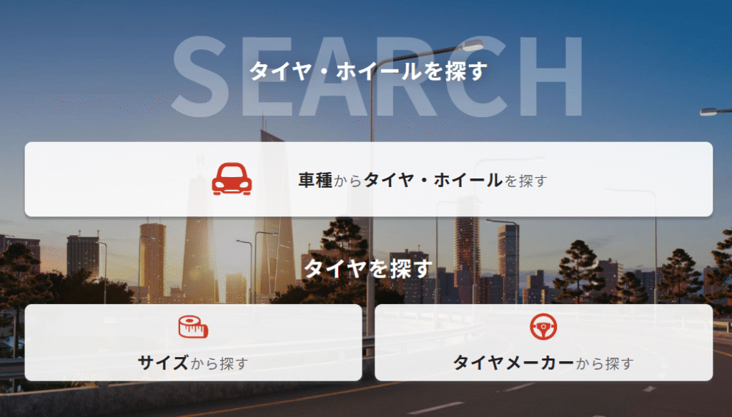自分の車のメーカーと車種を選択するだけで、適合するタイヤが表示されます。